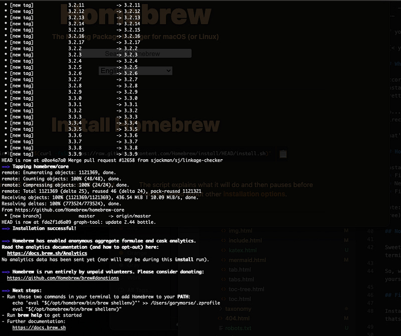 Sweet. Now you have all that Homebrew goodness. But, before you go too far, read the instructions about adding homebrew to your PATH. you will see two commands you need to run in the terminal that will ensure when you type brew, the terminal actually knows what to do. Run those two commands and now you are ready to do some installing.